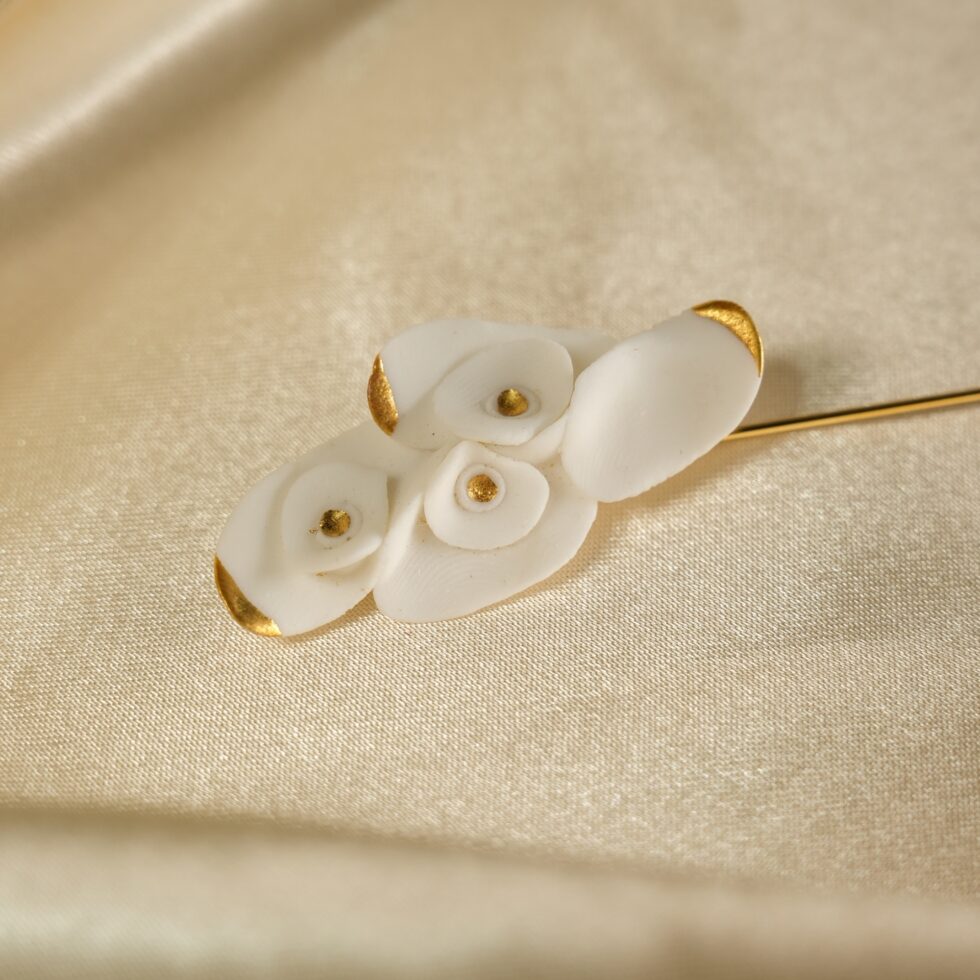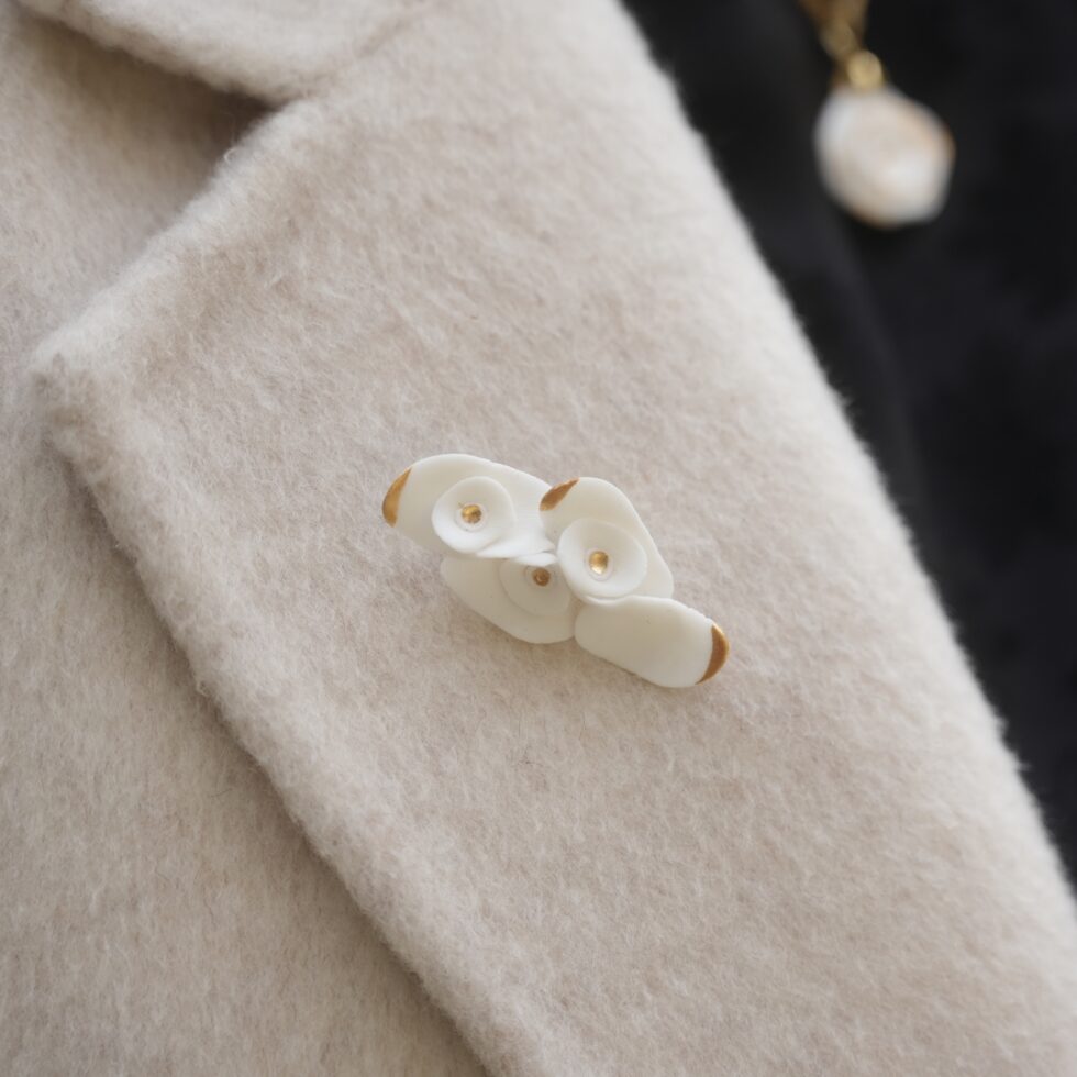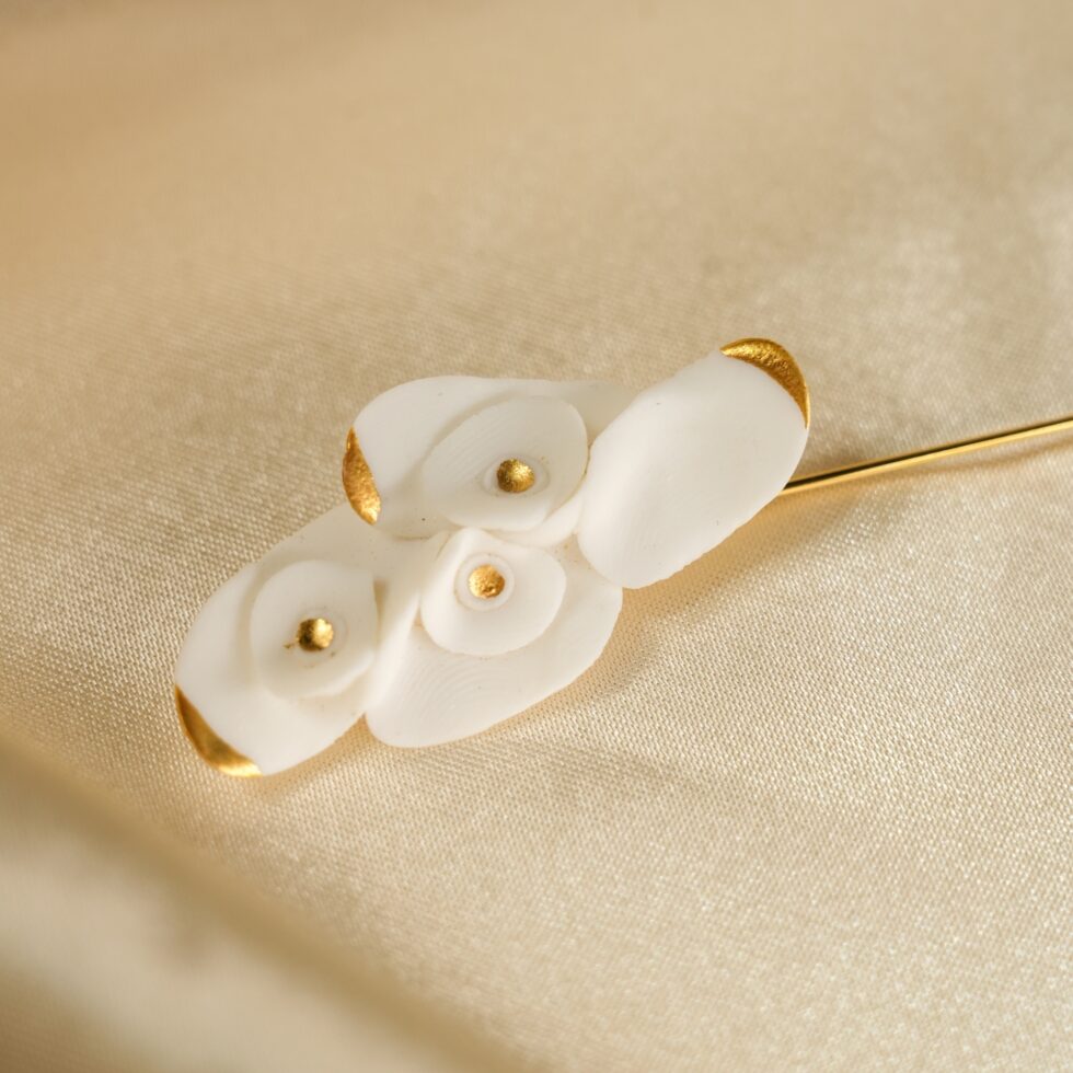 Artisan-sculpted white ceramic magnolia brooch with delicate gold powder detailing on petals and centers, set on a premium 14K gold-plated pin. A timeless, elegant accessory to elevate blazers, coats, and scarves.