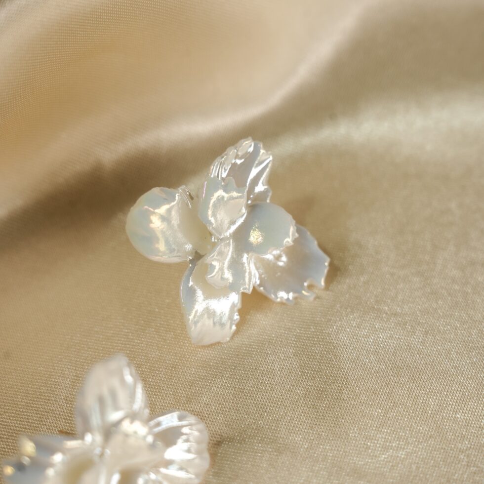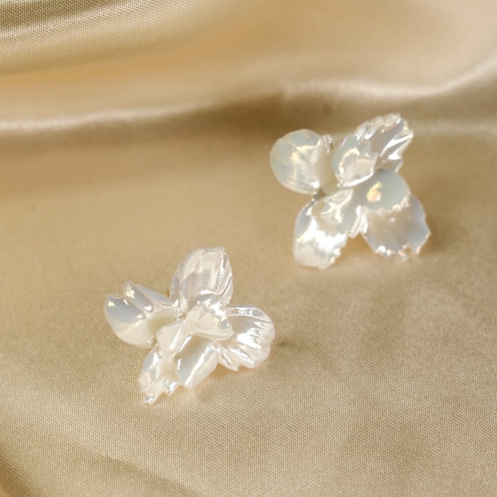 Artisan-carved white ceramic violet flower earrings with iridescent pearlescent glaze, set on hypoallergenic 925 sterling silver posts. A delicate, romantic statement piece symbolizing elegance and purity, perfect for everyday luxury.