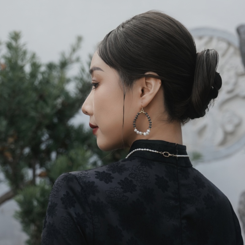 andmade Natural Pearl & Black Ceramic Hoop Earrings