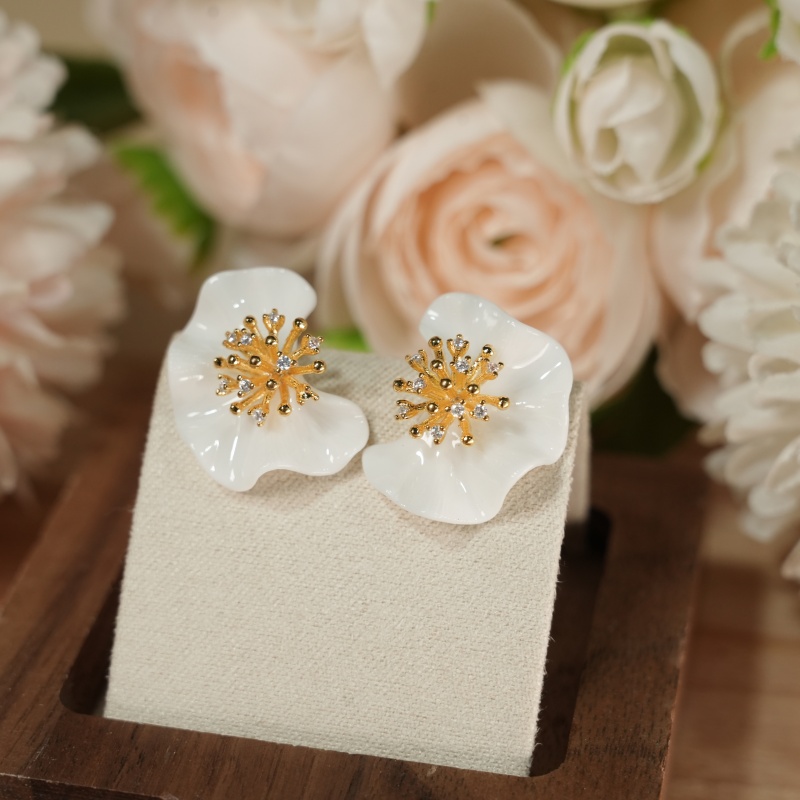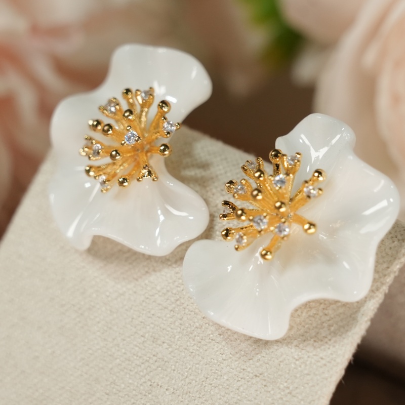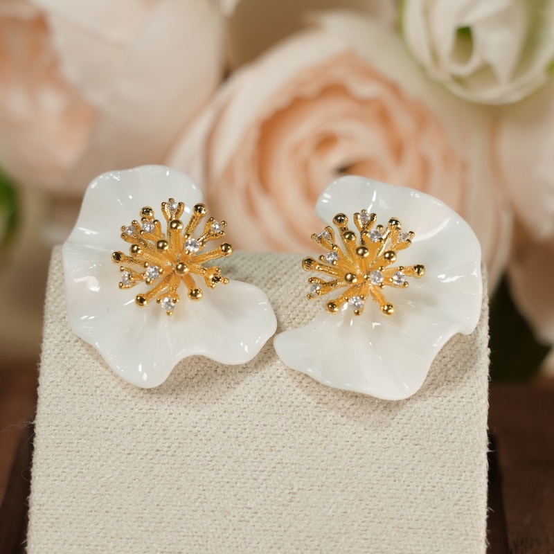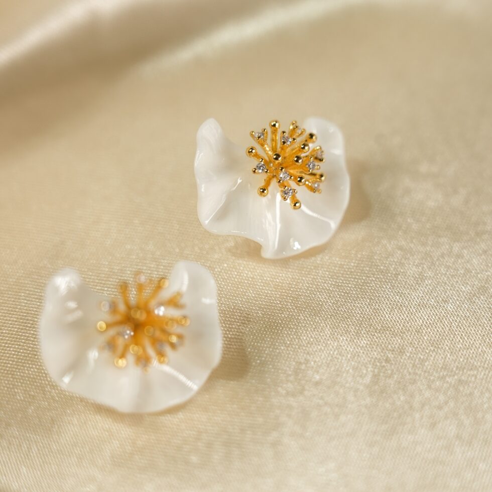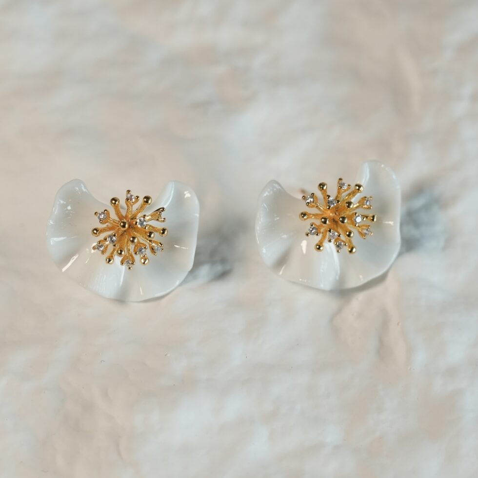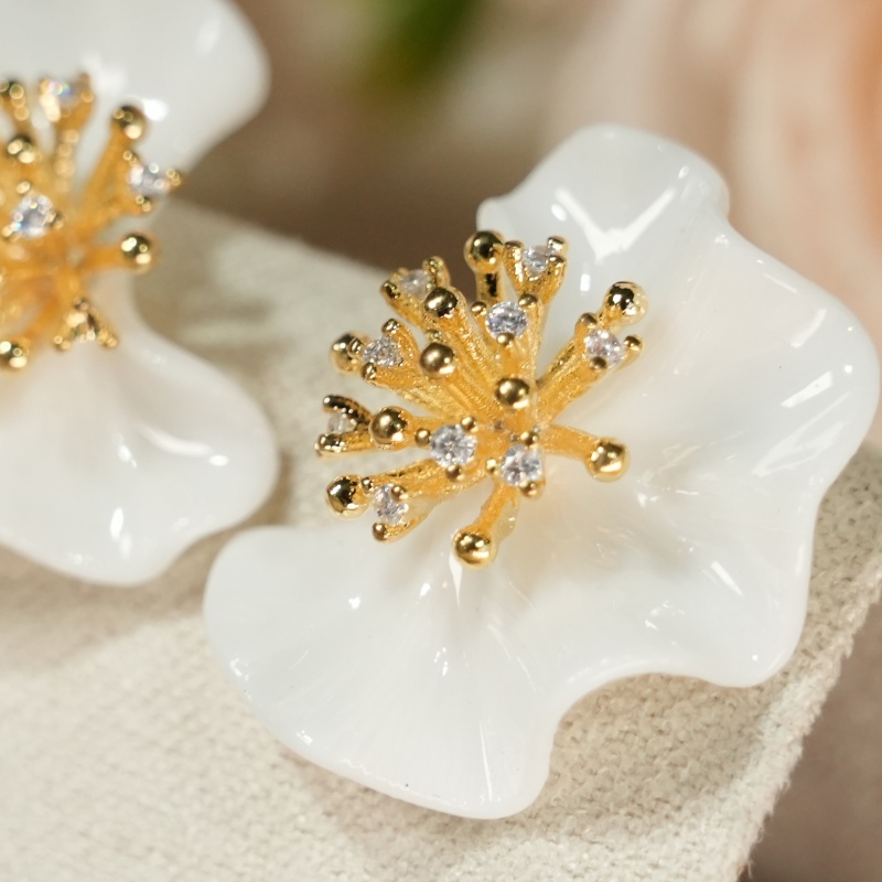 Artisan-sculpted glossy white ceramic peach blossom earrings, centered with a sparkling 925 sterling silver gold-plated stamen set with cubic zirconia. A delicate, elegant symbol of spring and beauty, hypoallergenic for everyday wear.