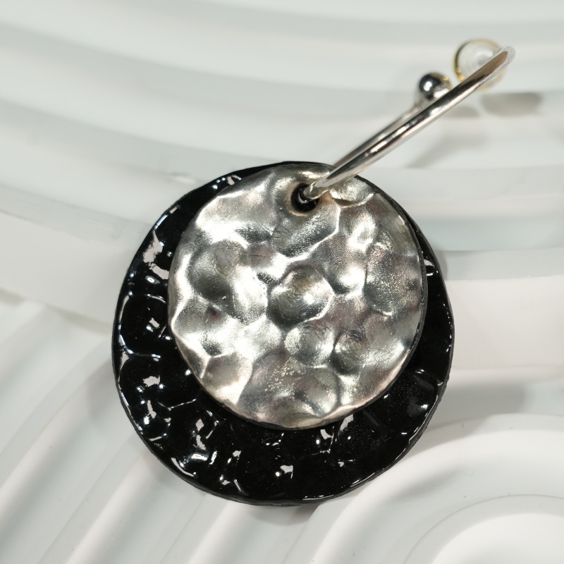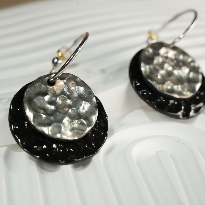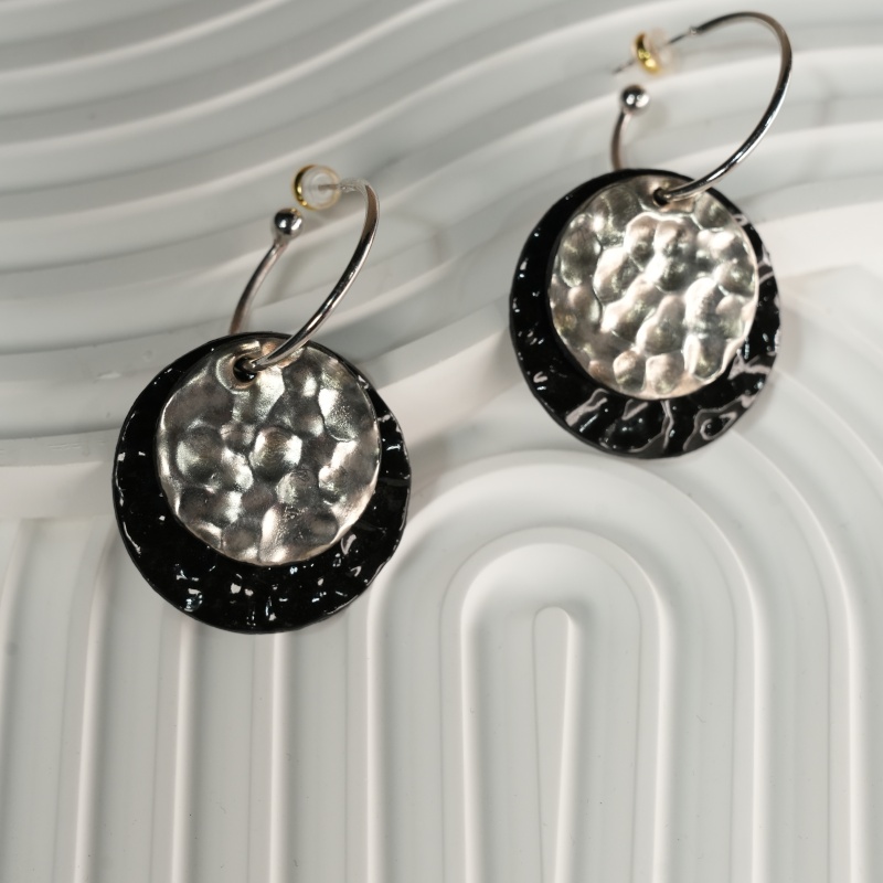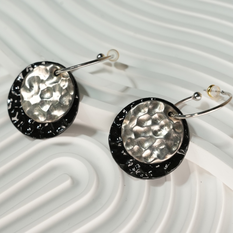 Handcrafted layered earrings with hammered silver discs and glossy black ceramic pendants, set on hypoallergenic 925 sterling silver hoops. A modern, edgy statement piece for everyday and occasion wear.